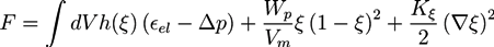 The second term is a double well potential as used in Landau theory. The second and third term provide an interface region of finite width. Wp and Vm are the potential height and the molar volume of the mixture, respectively. In alloy systems, the coefficients Wp/Vm and Kξ can be extracted from the surface energy and the interface width. For the function h(ξ) ≡ ξ2(3 − 2ξ) one has h(0) = 0, h(1) = 1, and h′(0) = h′(1) = 0, so that the derivative of the first part of F is only finite in the interface region. The term ∆p ≡ p(osm) − p(eq) is the difference between the osmotic pressure and p(eq), where p(eq) is the osmotic pressure at the initial equilibrium configuration from which the displacement u is measured. The osmotic pressure p(osm) is defined as [20]: