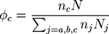 The model system resembles an incompressible polymer blend with a constant overall density ρ0 and three types of polymers j = a, b, c. The system consists of (i) na homopolymers of type a with A monomers and a length Na, (ii) nb homopolymers of type b with B monomers and a length Nb, (iii) nc polymers of type c, which are symmetric diblock copolymers AB that have a length of Nc ≡ N. The system stoichiometry is determined by the volume fraction of copolymers: