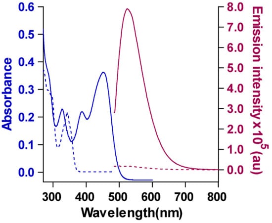 The absorption and emission spectra of CB showed the characteristic peaks of carbazole fluorophore at 284, 327, 386, and 453 nm in the UV spectrum and an emission peak at 520 nm upon excitation at 465 nm. The absorption peak at 450 nm indicates the presence of the extended conjugation of the fluorophore with the two barbiturate groups, which leads to absorption at a higher wavelength [19]. The emission peak was also shifted to a higher wavelength compared to that of the starting material (1) (Figure 1), but at a much lower intensity; these observations were most likely due to the extended conjugation.