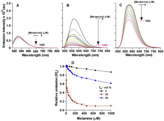 In order for CB to be an effective sensor for melamine in food samples, we needed to test its ability to detect melamine in an aqueous environment. Hence, we monitored the emission spectra of CB at different concentrations of melamine in 50% aqueous solution (1:1 volume ratio of DMSO and H2O) and in 99% aqueous solution (1:99 volume ratio of DMSO and H2O). The obtained spectra (Figure 2B,C) showed that there was a significant decrease in the emission intensity of CB upon the increase in the concentration of melamine for both solutions, but to different extents. The results in 50% aqueous solutions showed that the emission decreased by 80% as the concentration of melamine increased to 200 µM or higher. However, the decrease in the 99% aqueous solution was to a much lower extent, reaching approximately 30% after 100 molar equivalents of melamine were added (at 1000 µM). This stronger effect of melamine on emissions in aqueous solutions as compared to DMSO was interesting, since H-bonding interactions between the sensor and melamine usually weaken in aqueous solutions. Another interesting observation from these titrations was the enhanced initial emission of CB as the concentration of water increased in the solution. The emission peak also shifted to higher wavelengths as the concentration of water in the solution increased. Thus, we further investigated the effect of water fraction (fw in the solution on the total emission of CB.