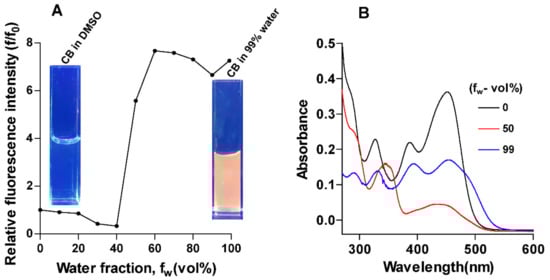 Figure 3 shows the change in the total emission of CB with a systematic increase in the concentration of water in DMSO. As water fraction (fw) in the CB solution increased, the total fluorescence emission of the sensor enhanced significantly (Figure 3A). Initially, as the water fraction increased from 0 to 40%, the total emission of CB slightly decreased (Figure 3A). However, with further increase of the water fraction to 60%, the emission increased by approximately 800% concomitant with a slight shift of emission peak to a higher wavelength; the emission did not show any significant further change as fw increased up to 99% water. The fluorescence enhancement of CB solution was visually observed under UV light illumination of the solution (Figure 3A insets).