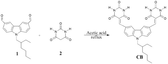 The fluorescent sensor was prepared in a one-step reaction (Scheme 2) of 9-(2-ethylhexyl) carbazole-3,6-dicarboxaldehyde (1) and barbituric acid (2) in acetic acid with excellent yield [19,20].