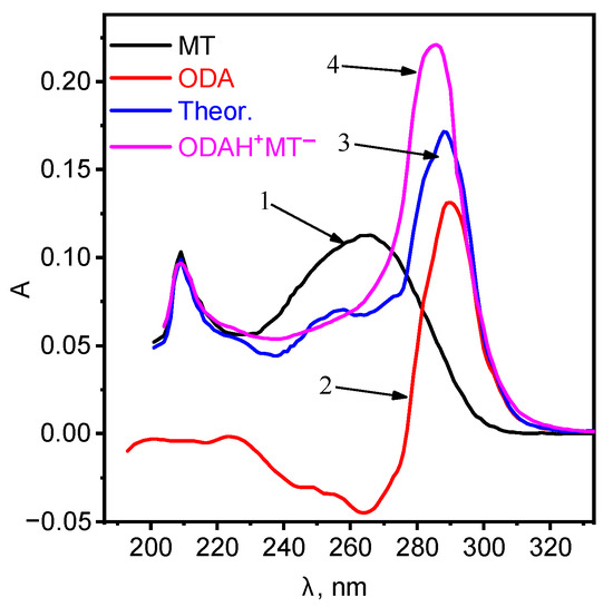 Absorption spectra of: 1—MT, 2—ODA, 3—summation of curves 1 and 2, 4—ionic associate ODAHMT.