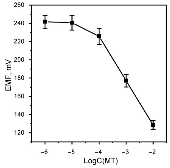 At pH from 0 to 3.5, MT exists in the cationic form, at pH > 7, in the anionic form, and in the acidity range of 3.5–7.0, tautomerism of the forms was observed. The dependence of the membrane solubility on the acidity of the solution is shown in Figure 4. It follows from the graph that at pH ≥ 7.3 MT has the maximum solubility and this interval is taken as the theoretical pH. functioning of the electrode.