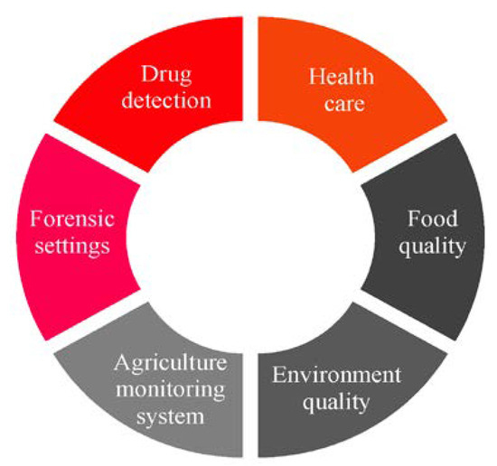 Most of the pollution sources are caused by human activities when industrial waste exceeds the self-purification capacity of the environment [102]. This situation can harm the natural ecological system of the environment as well as human health. To overcome this problem, new technologies and procedures to monitor the contamination levels in the polluted environment are essential. Sona Krizkova et al. [103] successfully presented an ultrasensitive detection with carbon paste electrodes to detect silver ions, with 0.5 µM as the estimated detection limit (3 dB/Noise ratio). Megha A. Deshmukh et al. [26] discussed the use of organic conducting polymers and carbon nanotubes to enhance the sensitivity and selectivity of heavy metal detections. Because of the unique electrical, chemical, mechanical, and structural properties of those materials, they have been adopted in the detection of trace metals, such as Pb2+, Cu2+, Cd2+, Zn2+, Hg2+, Cr2+, Ni2+, and Co2+.