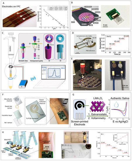 (A) From left to right, shows a fabricated device containing three pairs of electrodes and pH sensitivity on a flexible printed circuit (FPC) board. Reproduced with permission. Copyright 2011, Elsevier [38]. (B) From left to right, schematic showing a printed circuit board (PCB) connector interfacing with a multiplexed microsensor array with working electrode (WE) and counter electrode (CE) on a polyethylene terephthalate (PET) platform. The entire device can be covered with a polydimethylsiloxane (PDMS) material to create a well for sweat collection. Reproduced with permission. Copyright 2016, American Chemical Society [40]. (C) Schematic diagram of a tip-shaped sensor system: 1. conical nozzle, 2. electrode tube with three electrode strips, 3. connector, 4. connect the electrode, 5. platinum cable of the potentiostat, 6. pipette nozzle, 7. outer sleeve, 8. the sleeve fixes the cable on the pipette. Reproduced with permission. Copyright 2021, Elsevier [41]. (D) From left to right, schematic of ion-selective electrodes (ISEs) and a reference electrode with polyvinyl butyral (PVB) material. The sweat sensing device can measure Na+ and Cl−. Reproduced with permission. Copyright 2017, National Academy of Sciences [45]. (E) The manufacture of an all-solid soil nitrate sensor. Left side, the high-precision automatic fluid distribution robot distributes poly(3-octyl-thiophene) and molybdenum disulfide (POT-MoS2) nanocomposite on the circular Au electrode. Right side shows photos of the equipment. Copyright 2019, American Chemical Society [46]. (F) From left to right, the explosion plot of the sensing device, an ion-selective device with integrated circuits on PCB. Reproduced with permission. Copyright 2018, American Chemical Society [49]. (G) From left to right, shows a screen-printed electrode, lithium manganese oxide (LiMn2O4), and electrochemical detection of Li+ in authentic human saliva. Reproduced with permission. Copyright 2019, American Chemical Society [65]. (H) From left to right, shows R2R printed electrodes, R2R gravure printing of electrode arrays on flexible PET substrate. To print electrode arrays, carbon ink (provides stability under high operating potential) is deposited on top of silver (provides good conductivity). The characterization curve is shown on the right. Reproduced with permission. Copyright 2018, American Chemical Society [9].