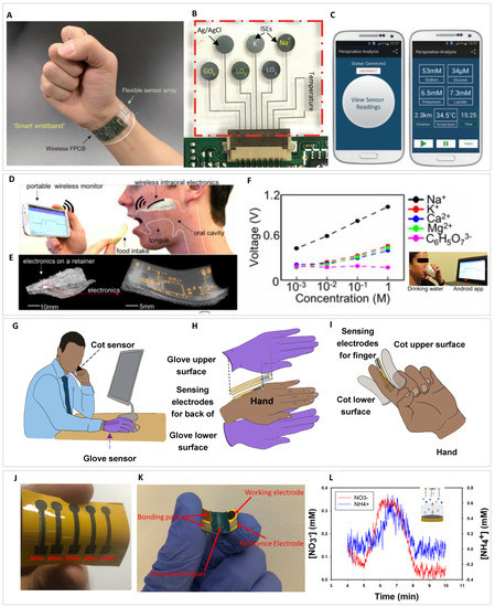 Wearable sweat sensor and ion sensing results via wireless Bluetooth transmission on a mobile device. (A) Shows the wireless flexible printed circuit board (FPCB) and integrated multiplexed sweat sensor array and of a wearable flexible integrated sensing array (FISA) on a subject’s wrist. (B) Multiplexed sensor array for sweat analysis. The red dashed box shows the sensor array. (C) A mobile application for real-time data display. (A–C) Reproduced with permission. Copyright 2016, Nature Publishing Group [82]. (D) Overview of real-time monitoring of sodium intake with intraoral electronics. (E) Images of an ultrathin intraoral device; the left figure shows electronics laminated conformably on an oral retainer and the right figure shows circuit interconnects on a porous membrane. (F) Sensing results in the presence of Na+, K+, Ca2+, Mg2+, and citric acid. The figure shows the amplitude output of the sodium sensor. The inset part shows in vivo testing setup with a human subject drinking the sodium solution. (D–F) Reproduced with permission. Copyright 2019, American Chemical Society [83]. (G–I) Natural sweat analysis with glove-based analytics. (G) Shows functionalized gloves and cots, which are included in glove-based sensors for natural sweat analysis during routine activity and sedentary without active sweat stimulation. (H) Illustrates the concept of allowing electrochemical sensors patterned on glove surfaces. For rapid sweat accumulation, nitrile is a crucial material of the glove to protect against evaporation. (I) Functionalized electrodes inside finger cots for sweat analysis. The nitrile cots can offer a condensed form factor that can be functionalized to detect sweat from gland-rich fingertips. Reproduced with permission. Copyright 2020, American Association for the Advancement of Science [88]. (J) Laser induced graphene (LIG) structure and functionalization for ion-selective sensing. Solid contact ion-selective electrodes (SC-ISEs) are patterned on a single polyimide swatch. (K) Shows representative electrodes used in soil column studies. (L) Illustrates the SC-ISEs’ ion sensing result. (J–L) Reproduced with permission. Copyright 2020, American Chemical Society [99].