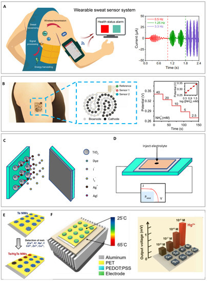 (A) From left to right shows integrated human motion energy harvesting a freestanding triboelectric nanogenerator (FTENG)-powered wearable sweat sensor system and the output energy. Reproduced with permission. Copyright 2020, American Association for the Advancement of Science [104]. (B) From left to right shows a biofuel-powered energy harvester and its output energy. The potentiometric responses of the NH4+ sensors are measured in 40 to 2.5 mM NH4+ solutions and they demonstrate near-Nernstian sensitivities of 60.3 mV per decade of concentration. Reproduced with permission. Copyright 2020, American Association for the Advancement of Science [108]. (C) Shows dye-sensitized solar cell (DSSC), which will produce a change with its electrical characteristics in response to the ionic species, while introducing Ag ions into the electrolyte of a DSSC results in the adsorption of Ag ions as well as the formation of metallic precipitation on the mesoporous TiO2 electrode. (D) Shows a representation of the testing procedure. The devices were connected to a Solartron Analytical Modulab test system. The impedance spectra and electrical characteristics were measured under 1 sun illumination and in the dark. (C,D) Reproduced with permission. Copyright 2014, Royal Society of Chemistry [116]. (E) Shows self-powered thermoelectric nanosensor and sensing process for Hg2+ detection. Tellurium nanowires (Te NWs) here acted as a thermoelectric material as well as a sensor. (F) The electrolyte is sucked into the vacuum cavity, and its sensing process for mercury ions are reported after electrochemical reaction. Finally, the electric output was performed by using Peltier system to create a temperature gradient across the thermoelectric nanosensors. (E,F) Reproduced with permission. Copyright 2019, Elsevier [119].