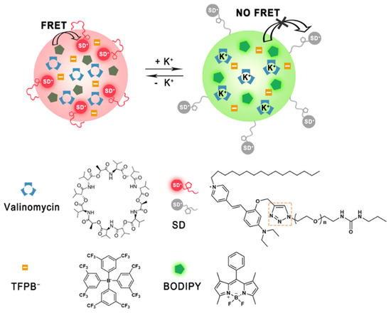 - Ruckh, T.T.; Skipwith, C.G.; Chang, W.; Senko, A.W.; Bulovic, V.; Anikeeva, P.O.; Clark, H.A. Ion-Switchable Quantum Dot Förster Resonance Energy Transfer Rates in Ratiometric Potassium Sensors. ACS Nano 2016, 10, 4020–4030. [Google Scholar] [CrossRef] [Green Version]