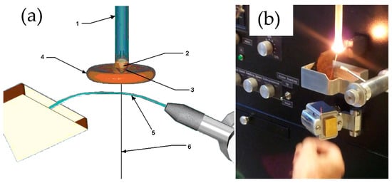 Schematic picture of the fabrication Taylor–Ulitovsky process allowing preparation of glass-coated microwires (a) (1—glass-tube, 2—alloy ingot, 3—glass-cone, 4—AC inductor, 5—coolant (water or oil) jet, 6—glass-coated microwire) and an image of the experimental setup for fabrication of microwires (b).