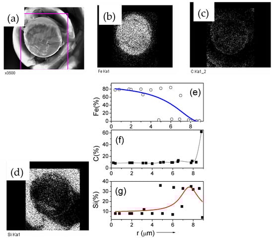 Cross section image (a) mapping of the Fe72.2B13.2Si10.9C2 microwire (d = 8 μm, D = 11.94 μm) for Fe (b), C (c), and Si (d), and distribution of Fe (e), C (f) and Si (g) elements along the microwire radius, r, for Fe72,2B13,2Si10,9C2 microwire (d = 13.2 μm, D = 17.6 μm). Reproduced with permission from [58].