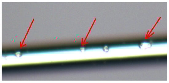 Bubbles in the glass shell observed in Fe74B13Si11C2 microwire (ρ ≈ 0.8) (indicated by the arrows). Reproduced with permission from [61].