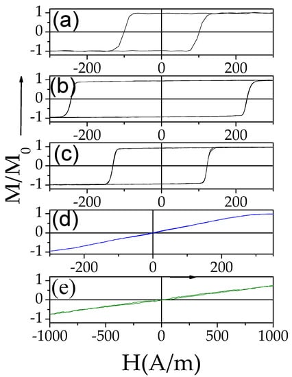 Magnetic properties of as-prepared microwires are reported elsewhere [4,17,31,32]. Therefore, we describe them very briefly. As described elsewhere [4,17,31,32], perfectly rectangular hysteresis loops are observed in microwires with positive λs (Fe, Fe–Co, and Fe–Ni based), while microwires with vanishing λs present a completely different (linear and almost unhysteretic with low coercivity, Hc) character of hysteresis loops (see Figure 4d,e).
