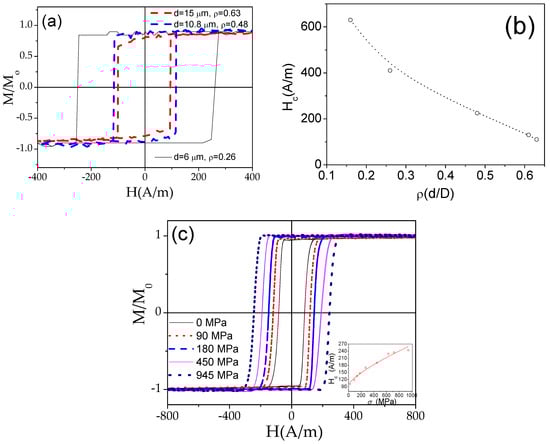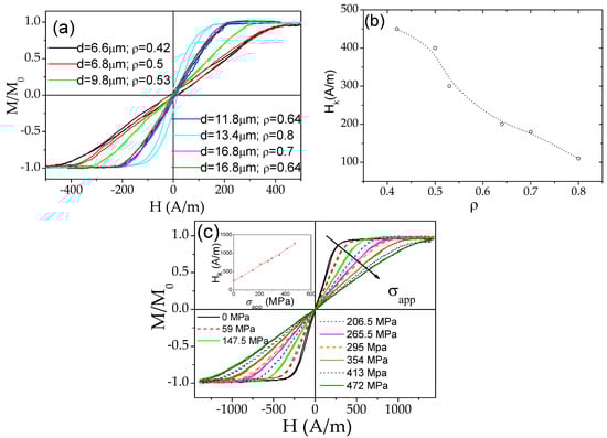 Hysteresis loops of Fe70B15Si10C5 microwires with different ρ-ratio (a), Hc(ρ) dependence for the same microwires (b), and effect of applied stress on the hysteresis loop of Fe75B9Si12C4 microwire. Hc(σapp) dependence is shown by the inset in (c). Plots (a,b) are adapted from [75] and (c) is reproduced with permission from [76].