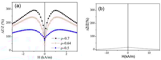 ΔZ/Z(H) dependencies of as-prepared Co67Fe3.85Ni1.45B11.5Si14.5Mo1.7 microwires with different ρ–ratios (a) and Fe75B9Si12C4 microwire (b) measured at 500 MHz. Plot (a) is reproduced with permission from [31] and (b)with permission from [77].