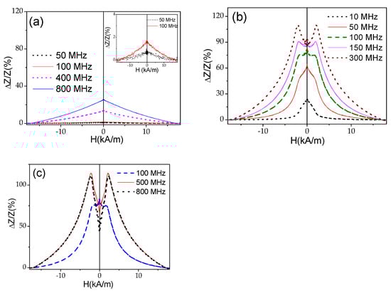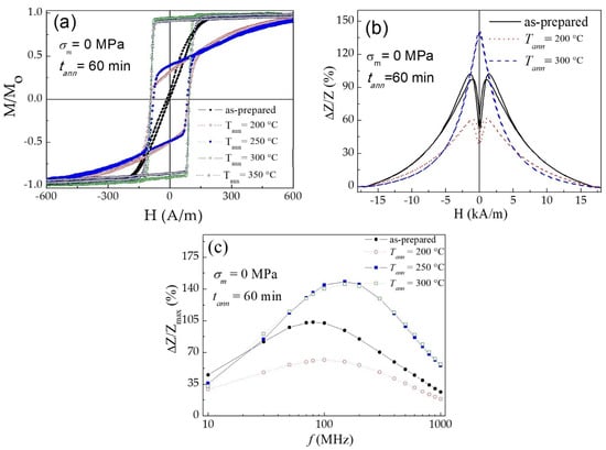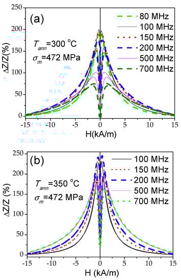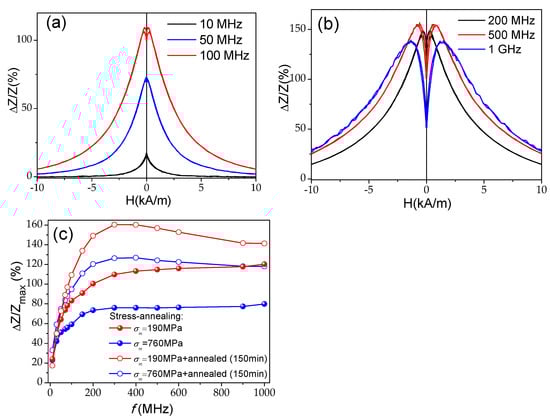 ΔZ/Z(H) dependencies of stress-annealed (σm = 472 MPa) measured at different frequencies for Tann = 300 °C (a), Tann = 350 °C (b), ΔZ/Zmax(f) dependencies for as-prepared and stress-annealed Co69.2Fe3.6Ni1B12.5Si11Mo1.5C1.2 microwires (c). Reproduced with permission from [84].