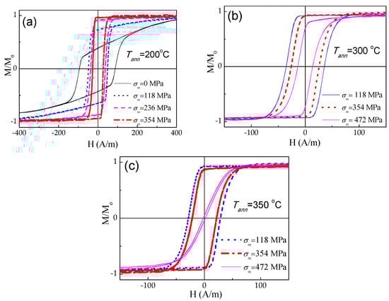 Hysteresis loops of Co69.2Fe3.6Ni1B12.5Si11Mo1.5C1.2 microwires annealed and stress-annealed at Tann = 200 °C (a), stress-annealed at Tann = 300 °C (b), and stress-annealed at Tann = 350 °C (c) at different σapp. Adapted from [84].