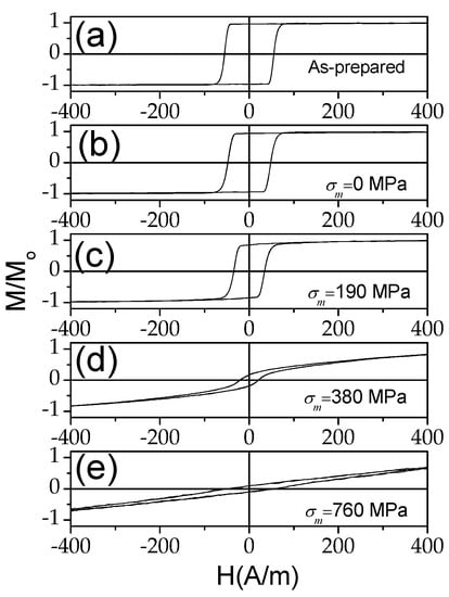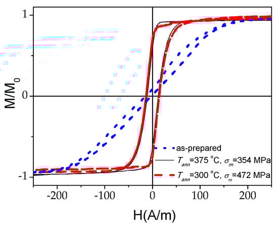 Hysteresis loops of as-prepared and stress-annealed at Tann = 300 °C, σm = 472 MPa, and Tann = 375 °C, σm = 354 MPa Co69.2Fe3.6Ni1B12.5Si11Mo1.5C1.2 microwires. Reproduced with permission from [84].