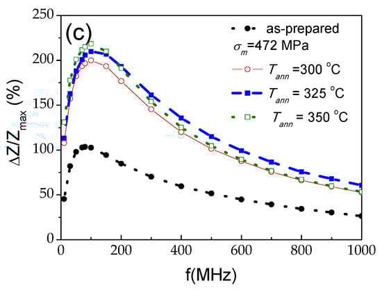 Accordingly, substantial GMI performance improvement was achieved in properly stress-annealed Co69.2Fe3.6Ni1B12.5Si11Mo1.5C1.2 microwires; ΔZ/Zmax ≥ 200% is observed in all stress-annealed (at σm = 472 MPa) Co69.2Fe3.6Ni1B12.5Si11Mo1.5C1.2 microwires (see Figure 11a,b). These ΔZ/Zmax values are almost twice those for as-prepared Co69.2Fe3.6Ni1B12.5Si11Mo1.5C1.2 microwires (see Figure 11c).