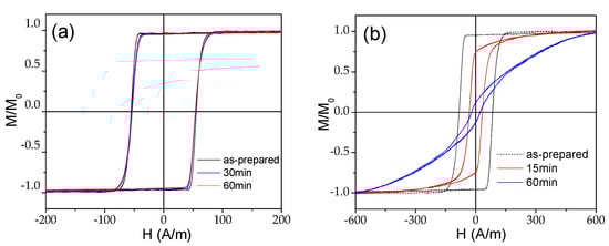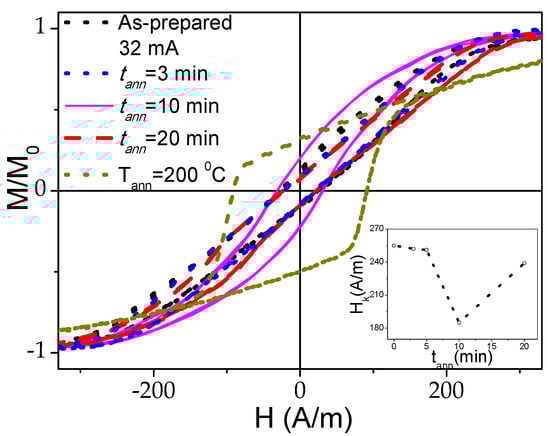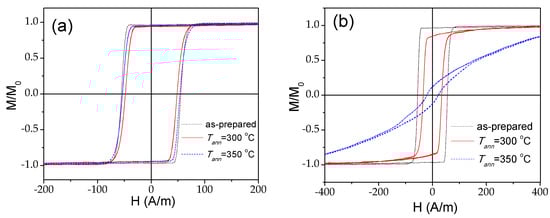 Similar to other Co-rich microwires, considerable magnetic hardening is observed upon conventional annealing: all annealed samples at 250 °C ≤ Tann ≤ 350 °C (tann = 60 min) present considerable magnetic hardening. Hysteresis loops of annealed samples turn to rectangular; a remarkable increase in Hc (from 4 up to 90 A/m) and remanent magnetization, Mr/Mo, upon annealing is observed (see Figure 8a). Finally, an almost perfectly rectangular hysteresis loop is observed for the sample annealed at Tann ≥ 350 °C (tann = 60 min).