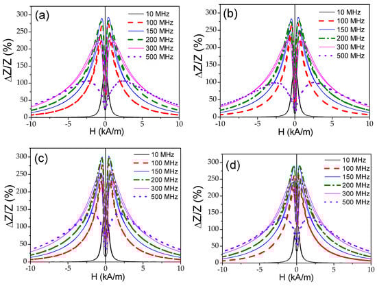 ΔZ/Z(H) dependencies measured at different f for as-prepared and Joule heated at 32 mA for 3 (a), 5 (b), 10 (c), and 20 min (d) Co67Fe3.9Ni1.4B11.5Si14.5Mo1.6 microwire. Adapted from [93].