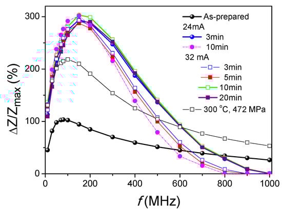 Accordingly, the relevant advantage of Joule heating treatment is that it allows for preventing the magnetic hardening observed upon conventional furnace annealing of Co-rich microwires with vanishing λs [83]. As observed in Figure 13, a remarkable increase in ΔZ/Zmax is observed in Joule heated samples.