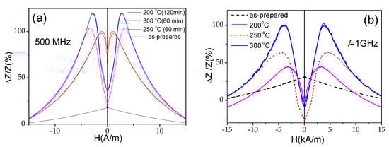A decrease in the maximum GMI ratio, ΔZ/Zmax, is observed after annealing at Tann = 200 °C, while an increase in the ΔZ/Zmax is observed at higher Tann (see Figure 8b,c). The character of ΔZ/Z(H) dependence gradually changes after annealing from double peak (for as-prepared microwire) to single peak (with ΔZ/Zmax at H = 0) (see Figure 8b).