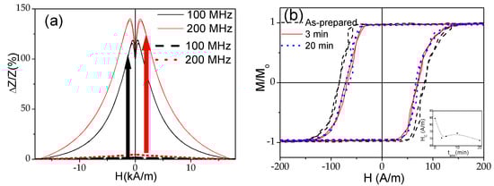 The frequency, fm, at which the highest ΔZ/Zmax value is observed in ΔZ/Zmax(f) dependence for as-prepared Co69.2Fe3.6Ni1B12.5Si11Mo1.5C1.2 microwire is at about 80 MHz (ΔZ/Zmax ≈ 100%). However, in stress-annealed samples ΔZ/Zmax ≈ 220% are observed at fm ≈ 150 MHz (see Figure 11c). The ΔZ/Z(H) dependence character is also affected by stress-annealing; a double peak ΔZ/Z(H) dependence is observed in stress-annealed Co69.2Fe3.6Ni1B12.5Si11Mo1.5C1.2 microwires (see Figure 11a,b). However, the maximum in the ΔZ/Z(H) dependence is observed at a magnetic field, Hm, lower than that of the as-prepared Co69.2Fe3.6Ni1B12.5Si11Mo1.5C1.2 microwire. This difference must be explained considering that Hm is linked to the magnetic anisotropy field [28,29,30].