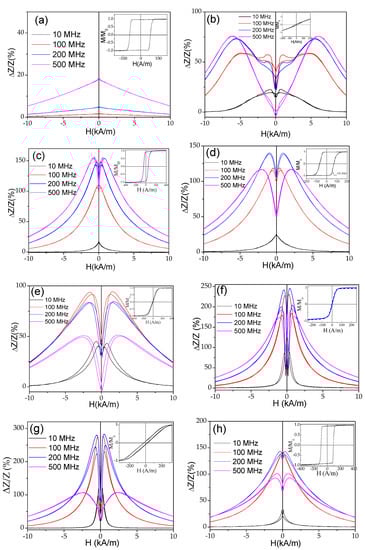High sensitivity of magnetic wire impedance, Z, to an applied magnetic field, H, or even to applied stresses is crucial for development of numerous high-performance magnetic and magnetoelastic sensors [30,31,32,33,34,35,36,37,38,39]. For characterization of the GMI effect, the commonly used parameter is the GMI ratio, ΔZ/Z, defined as [28,29,30,31,32,33]: