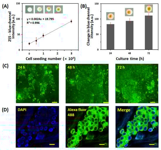 We evaluated the efficiency of cell seeding in the paper-based 3D cell culture platform of collagen-coated paper substrate and agarose-medium hydrogel. First, we seeded varying numbers of LNCaP cells (0, 5.0 × 103, 1.0 × 104, or 3.0 × 104 cells/20 μL culture medium) on the collagen-coated paper, cultured them on the agarose-medium hydrogel for 24 h, and then performed a WST assay. As the WST reagent is only active in metabolically intact cells, the intensity of the reacted product directly relates with the number of viable cells [36]. Figure 2A shows the effect of the number of paper-based 3D-cultured LNCaP cells on WST color intensity (255-blue channel intensity): the LNCaP cell number was linearly proportional to the color intensity with R2 = 0.996. This result indicated that LNCaP cells were viable on the paper-based 3D cell culture platform. To confirm cell survival and proliferation over time in the paper-based 3D cell culture platform, 3.0 × 104 cells were seeded on collagen-coated paper and cultured for 24, 48, or 72 h, which was followed by WST and L&D analyses. As shown in Figure 2B,C, the LNCaP cells were not only viable for up to 72 h but were also able to proliferate in the paper-based 3D cell culture platform over this period. The characterization of LNCaP cells on the paper-based cell culture platform was performed using confocal microscopy. The expression of prostate-specific antigen (PSA), a prostate cancer marker used clinically for early screening, was demonstrated in LNCaP cells cultured in the paper-based 3D cell culture platform, as shown in Figure 2D. These results demonstrated that the paper-based 3D cell culture platform provided an appropriate culture environment for LNCaP cells.