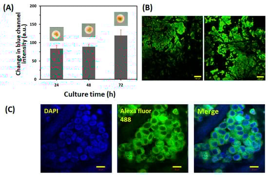 To validate the feasibility of cell culture within the paper-integrated analytical device, we compared the viability and proliferation of LNCaP cells between the paper-based 3D cell culture platform and the paper-integrated analytical device. First, 3.0 × 104 cells were seeded onto the collagen-coated paper and cultivated on the agarose-medium hydrogel within the paper-integrated analytical device for up to 72 h. Then, the quantification of viable cells was performed using the WST assay. As shown in Figure 3A, LNCaP cells were able to proliferate in the paper-integrated analytical device for up to 72 h: the change in blue channel intensity of the WST assay of LNCaP cells in the paper-integrated analytical device was very similar to that in the paper-based 3D cell culture platform at 48 and 72 h. In addition, as shown in Figure 3B, LNCaP cells were able to proliferate and form clusters for up to 72 h, which was consistent with the results of previous reports indicating that LNCaP cells tended to aggregate in 3D culture environments [37]. Therefore, LNCaP cells in the paper-integrated analytical device were as proliferative as those on the paper-based 3D cell culture platform. Figure 3C shows an immunofluorescence staining image of anti-PSA-stained LNCaP cells after 72 h of culture in the paper-integrated analytical device. As shown in Figure 3C, LNCaP cells were stained successfully with PSA antibody and showed similar morphology to cells grown on the paper-based 3D cell culture platform alone, indicating that LNCaP cells in the paper-integrated analytical device maintained the characteristics of this prostate cancer cell line. These results showed that the paper-integrated analytical device was able to provide an appropriate cell culture environment for the growth and proliferation of LNCaP cells.