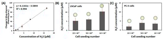 To confirm the performance of our paper-integrated analytical device, we compared the difference in H2S release between two LNCaP and PC-3 prostate cancer cell lines cultured on the prepared paper, as reported in our previous study [19]. The LNCaP and PC-3 cells were seeded onto hydrophilic zones on each paper at a density of 2.5 × 104, 5.0 × 104, or 1.0 × 105 cells/20 μL culture media, respectively. Meanwhile, both Cys (5 mM) and H-Cys (1 mM) were mixed with the agarose-medium hydrogel solution before solidification. The treated agarose medium was solidified within the bottom reservoir of the paper-integrated analytical device. After pre-incubation for 30 min, cell paper was placed on the agarose-medium hydrogel containing Cys and H-Cys. After inserting the H2S-sensing paper, the paper-integrated analytical device was transferred to a 5% CO2 incubator and incubated at 37 °C for 72 h. After incubation, the blue channel intensity of the H2S-sensing paper was analyzed using a scanner and ImageJ software. The concentration of H2S was calculated using the calibration plot for the H2S-sensing paper.