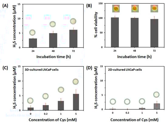 Finally, we compared H2S release from 2D- and 3D-cultured LNCaP cells using the H2S-sensing paper. As shown in Figure 5D, H2S release from 2D-cultured LNCaP cells was detected only after incubation with 5 mM Cys (2.00 ± 0.85 μM) but not with 0, 0.2, or 1 mM (results were below the LOQ). This result indicated that 3D-cultured LNCaP cells produced more H2S than did 2D-cultured cells, which is a result that might be attributed to the difference of LNCaP cell morphology of 2D and 3D cultures as well as more effective activation of cells by Cys in the 3D environment.
