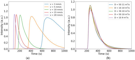 Simulated signals represented in Figure 4a were obtained by changing the flow velocity and keeping constant the diffusion coefficient having a value of 3 × 10−10 m2/s. This value was chosen based on information nanoparticles with a typical size of about 2 nm [38]. It can be observed that none of the signals in question have a Gaussian distribution but are all curves with distorted symmetry. This is caused by the parabolic flow velocity profile, whereby what is in the center of the channel travels faster and reaches the receiver sooner, while what is near the walls is transported more slowly, causing a long tail in the signal (tailing effect). Transport is a non-homogeneous process. As the flow velocity decreases, it is noticeable how the dispersion increases, manifesting itself in increasingly less intense and sparse signals. On the other hand, an increase in flow velocity allows the substance to stay more compact during its journey from transmitter to receiver and the signal will be more intense. Figure 4b shows that significant changes in the diffusion coefficient have very little effect on the shape and intensity of the signals. Considering an intermediate value of flow velocity between those considered in Figure 4a equal to 8 mm/s and varying D by almost 2 orders of magnitude always results in highly distorted Gaussian distributions. With mChannel sizes, while analyzing operating ranges of flow velocity and diffusion coefficient typical of molecular communication experiments, non-Gaussian signals are obtained.