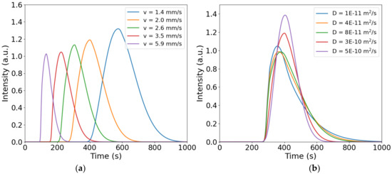 Simulated signals obtained in a channel having radius 0.375 mm and length 30 cm; (a) colors are associated with different values of flow velocity, while a constant diffusion coefficient of 3 × 10−10 m2/s is used; (b) colors are associated with different values of diffusion coefficient, while a constant flow velocity of 2 mm/s is used.