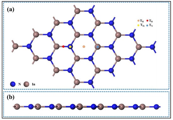 Figure 1. (a) Top view and (b) side view for geometric construction of the pristine InN monolayer.