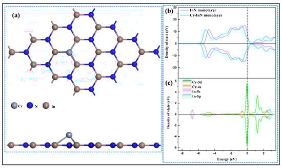 DOS analysis was used to explore the effect of Cr atom doping on electronic distribution. It is believed that TDOS can reflect the electron density distribution of a system; as shown in Figure 2b, the electrons of the Cr–InN monolayer moved to a slightly lower energy direction compared to those of the intrinsic InN monolayer. Moreover, some new states were added to the Cr–InN monolayer, which narrowed the intercept near the Fermi level of the TDOS curve of Cr–InN. These phenomena indicate that the introduction of a Cr dopant reduced the intrinsic band gap of InN and improved the electronic activity of the InN monolayer. Regarding PDOS, the overlap between the curves representing the atomic orbitals indicates the orbital hybridization of atoms, which is usually used to explain the bonding between a dopant and intrinsic material (shown in Figure 2c); the overlap between the 5s orbital (In-5s) of the In atom and the Cr-3d orbital at −7 eV and the overlap between the In-5p orbital and the Cr-4s orbital in the range from 1 to 4 eV indicate strong orbital hybridization between these two atoms, thus demonstrating that Cr atoms have been successfully incorporated into the InN monolayer system.