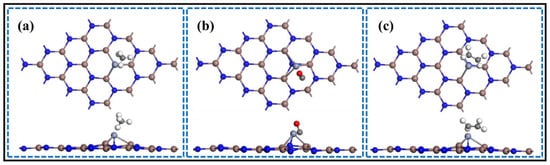 We established and optimized the molecular models of CH4, CO, and C2H4 in Dmol3, and we carried out adsorption calculations based on the Cr–InN model constructed above. It is obvious that there were many possible ways for each gas to adsorb on the Cr–InN monolayer. In order to figure out the optimal adsorption structure of each gas, different approaching atoms and adsorption angles were used to obtain all possible adsorption structures, the Eads and Qt of which were compared. The selected adsorption structures for the three gases with the optimal parameters in the system are shown in Figure 3, and the Eads and adsorption distance corresponding to each structure are shown in Figure 4.