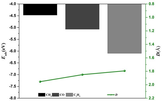 Figure 4. The adsorption energy and adsorption distance of CH4, CO, and C2H4 on the Cr-InN monolayer.