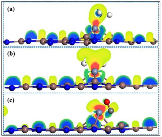 Electron density reveals the probability that electrons are distributed in a particular location surrounding an atom or molecule. By calculating the deformation charge density (DCD), bond formation can intuitively observed and charge transfer can be qualitatively analyzed in an adsorption system [30]. The charge transfer values of CH4, CO, and C2H4 are shown in Table 1, and the deformation charge density is shown in Figure 5.