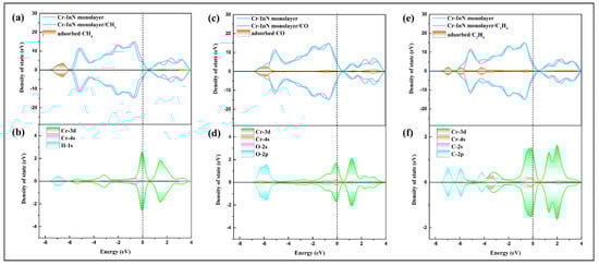 Figure 6. TDOS of (a) Cr-InN/CH4, (c) Cr-InN/CO, and (e) Cr-InN/C2H4; PDOS of (b) Cr-InN/CH4, (d) Cr-InN/CO, and (f) Cr-InN/C2H4 adsorption systems.