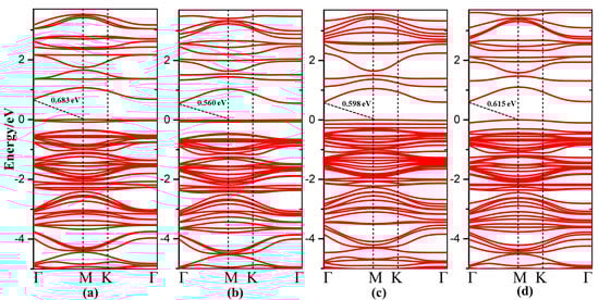 It is widely believed that there is a classic relation between band gap and electrical conductivity [31,32], that is, at a certain temperature, the conductivity is inversely proportional to the band gap. Here, band structure was used to qualitatively analyze the influence of gas adsorption on the band gap of the Cr-doped InN monolayer.