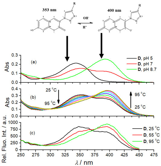 The UV/Vis spectra of 7-hydroxycoumarin and its derivatives are pH-dependent due to the two tautomeric forms [38]. We repeated the experiment by collecting UV/Vis spectra of referent amino acid coumarin D at various pH (Figure 1a, pH = 5.0, 7.0 and 8.7) and got comparable results, thus attributing particular UV/Vis spectra to the dominant form of the corresponding tautomer. The fluorescence excitation spectra of D show comparable dependence on pH (Figure 1). Other coumarin peptidoids (B, B-boc, C) showed comparable changes in UV/Vis spectra (Supplementary Materials, Figures S6–S8), pointing out universal responsiveness of coumarin tautomerism. Surprisingly, we noticed that heating solutions of all studied coumarin derivatives resulted in changes of their UV/Vis spectra (Figure 1b) comparable to pH-dependence (Figure 1c). To the best of our knowledge, such temperature dependence of coumarin tautomerism was not reported previously. Since temperature dependent experiments were done in a buffered solution, pH 7.0, buffer keeping the pH constant during heating, the observed change of the UV/Vis spectrum could be attributed to the shift of coumarin tautomeric equilibrium toward anionic species, caused likely by temperature-sensitive electronic distribution within aromatic system.