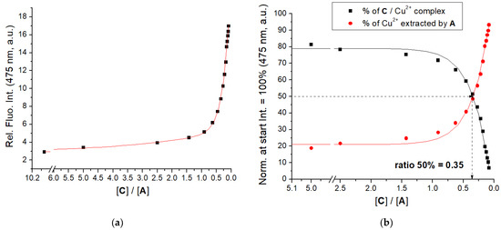 (a) Changes in fluorescence of C (c = 1 × 10−6 M, λexc = 353 nm, λem = 475 nm) in the complex with CuCl2 (c = 1 × 10−6 M) upon addition of A; (b) the percentage of C or Cu2+ released from the C/Cu2+ complex. Done at pH 7.0; sodium cacodylate buffer, c = 50 mM.