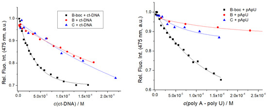 Fluorimetric titration of B, B-boc, C (c = 1 × 10−6 M; λexc = 353 nm) with ct-DNA and poly A–poly U: dependence of fluorescence at λmax = 475 nm on c(DNA, RNA). Done at pH 7, sodium cacodylate buffer, c = 50 mM.