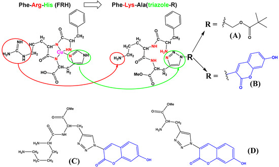 Comparison of naturally occurring FRH peptide (drawn as a complex with Cu2+) sequence with here designed and prepared FKA(triazole) analogs (A,B), and referent dipeptide (C) and amino acid (D). Red denotes replacement of Arg- with Lys-; green denotes replacement of Hys-imidazole- with triazole-; blue denotes coumarin chromophore.
