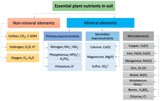The main constituents of SOM playing a fundamental role in balanced soil system formation, besides carbon, are nitrogen, phosphorus, and potassium (N, P, K). All these macronutrients are essential for soil stability and fertility, and play important roles in healthy plant growth. The soil’s fertility is its ability to produce large and high-quality yields of agricultural plants over a long period of time when optimal agronomic practices are applied. A distinction is made between actual (for a given growing season) and potential (long-term realized, total) fertility. Actual soil fertility is part of potential fertility. Potential fertility is characterized by such parameters as: stocks of nutrients for plants and their mobile forms, optimal (both for plant growth and mobilization of nutrients) aeration, and moisture and temperature regimes [33]. Carbon is the basis of the organic compounds that form plants, and the main element in humic substances in soil, humates, and fulvates. It is responsible for potential and actual soil fertility. The humic substances content of soils varies from 0 to almost 10% [34]. Evaluations of the total amounts of organic carbon in soils and organic fertilizers is important are agricultural chemistry, since such values can represent the potential fertility of a soil, and often serve as measures of fertilizers’ effectiveness. Nitrogen is fundamental in chlorophyll synthesis and is an essential element of enzymatic proteins that catalyze and regulate the plant growth processes. Most soil nitrogen is preserved in organic compounds in SOM. The content of mineral forms of nitrogen available to plants usually does not exceed 1–2% of the total nitrogen content in the soil. The inorganic forms of soil N are nitrite (NO2−), nitrate (NO3−), and ammonia (NH4+), with nitrate being the most stable and form available to plants. Phosphorus plays an important role in stimulating root growth. Plants absorb free phosphoric acid and its water-soluble mono- and bis-substituted salts at pH 6.0–7.0. These forms are the most available forms to plants, alongside some organic phosphorus compounds, such as sugar phosphates and phytin. Plants also absorb sulfates and sulfur-containing amino acids from the soil in very small amounts. The amount of potassium needed for plant growth is equivalent to or greater than the amount of nitrogen needed. Potassium is absorbed by plants as a cation, and regulates the water uptake and CO2 exchange. It is important in production and transport of sugars, and in the enzymatic processes that ensure photosynthesis [35]. Overall, 17 soil nutrients have been established as essential for plant growth [36]. They are listed in Figure 1 in the forms taken up by the plants [37].