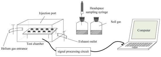Recently, Zhu et al. reported an artificial olfactory system based on 10 identical gas sensors (IDT SGAS707 type polymer-MOx composite material gas sensors from Integrated Device Technology Inc., San Jose, CA, USA) operating at different temperatures for soil organic matter (SOM) determination through the detection of VOCs in emitted soil gas, with the aim of amending the optimized fertilization of cultivated soils [48]. See Figure 2.