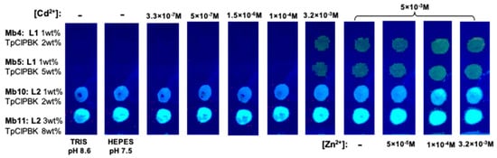 In recent work by our group, the two fluorescent chromophores obtained from the 2,8-dithia-5-aza-2,6-pyridinophane macrocycle substituted either with 2-(20-hydroxy-30-naphthyl)-4-methylbenzoxazole (HNBO, ligand L1) or 7-(2-ethylamino)-4-methylcoumarin (ligand L2) were tested for the detection of Cd(II) and Zn2+ ions in soils [158]. Ligands were incorporated inside PVC membranes, and optical sensors and a sensor array based on the photoassisted technique (PT) for sensing membrane luminescence were developed; see Figure 6. The enhanced selectivity to Cd2+ of L1-doped optodes has permitted the detection of this ion in aqueous extracts of tree soil samples with different andrological impacts (see Section 4 for more details). The results were in agreement with the Cd2+ contents estimated with the standard AAS method ([Cd2+]L1 = 0.511, 0.007, 0.024 mg/kg vs. [Cd2+]AAS = 0.574, 0.010, 0.030 mg/kg for airport, garden, and waste dump samples, respectively).