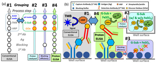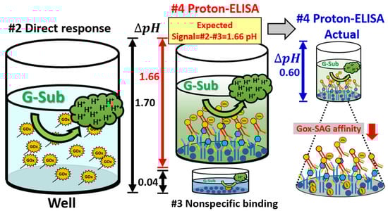 The following are available online at https://www.mdpi.com/article/10.3390/chemosensors10010005/s1, Figure S1: Schematic plot of the reaction of Proton-ELISA with GOx and FeSO4 solution. Figure S2: The pH change by a different washing process including no wash, PBST only and PBST + KCl washing for Gox and G-sub reaction, which followed the same protocol as Part #2. It can be clearly seen PBST + KCl washing had reduced the buffer residue and its function.
